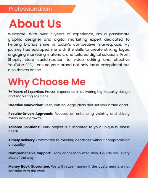 Welcome! With over *7 years of experience*, I’m a passionate graphic designer and digital marketing expert dedicated to helping brands shine in today’s competitive marketplace. My journey has equipped me with the skills to create striking logos, engaging marketing materials, and tailored digital solutions. From Shopify store customization to video editing and effective YouTube SEO, I ensure your brand not only looks exceptional but also thrives online